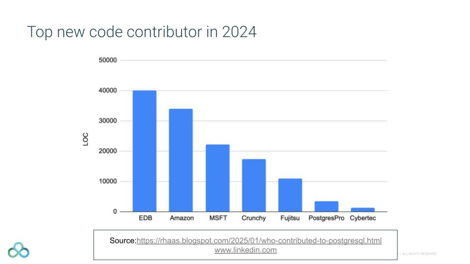 2024년에는 EDB가 Postgres에 가장 많은 코드를 기여했고, 가장 많은 패치 작성자를 배출했습니다. 특히, 신규 코드 기여자가 많아졌다는 점은 PostgreSQL 전문성이 더욱 확산되고 있다는 긍정적인 신호입니다.