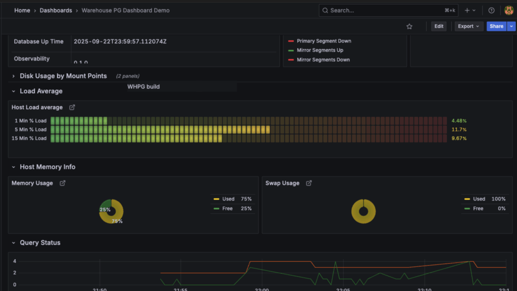 이번 릴리스는 또한 새로운 관찰 가능성(observability) 도구를 통해 WarehousePG 클러스터 상태, 쿼리 성능을 포괄적인 대시보드에서 모니터링할 수 있도록 지원합니다. **PXF(Platform Extension Framework)**를 통해 HDFS, 클라우드 스토리지, ORC, AVRO 등 기존 인프라 및 외부 데이터 소스에 대한 통합 액세스도 제공합니다.