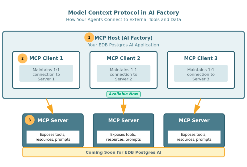 [그림 2. AI Factory와 MCP의 연동: 에이전트와 외부 도구/데이터 연결] [1] MCP 호스트 (AI Factory): (현재 사용 가능) 모든 것을 오케스트레이션하는 중앙 AI 앱. [2] MCP 클라이언트: (현재 사용 가능) AI Factory가 자동 생성하는 내부 연결 관리자. [3] MCP 서버: (출시 예정) GitHub, Slack 등 외부 서비스.