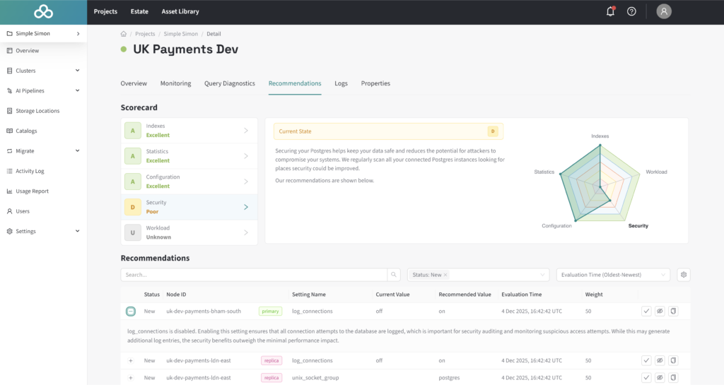 [그림 5 설명] EDB PG AI 하이브리드 매니저의 상세 보기 화면은 보안 및 구성 권장 사항을 제공하며, Postgres 모범 사례(Best Practices)와 자동으로 대조하여 점검하고 간단하게 적용할 수 있는 변경 사항을 제안하여 리스크를 사전에 완화합니다.