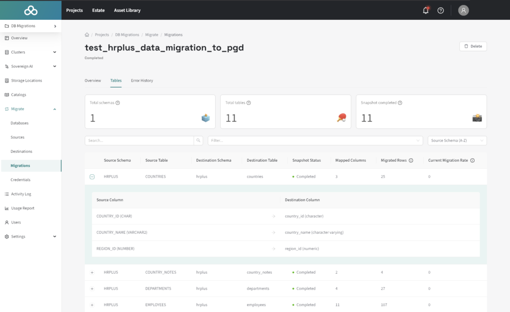 [그림 6 설명] EDB PG AI 하이브리드 매니저는 마이그레이션 진행률, 총 마이그레이션 수, 전송 속도, 행(Row) 수와 같은 향상된 테이블 세부 정보를 통해 대량 마이그레이션(Bulk Migrations)을 지원합니다. 로그를 일일이 확인할 필요 없이 실시간으로 전송 현황을 추적할 수 있습니다.