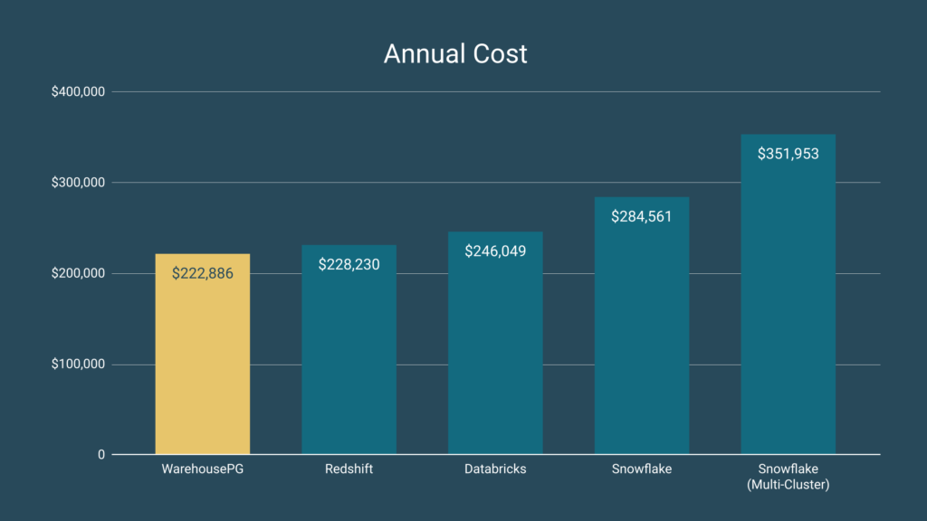 McKnight Consulting Group의 2026년 2월 벤치마크가 이를 수치로 증명합니다. 최고 동시성 처리를 위해 Snowflake를 3개의 멀티 클러스터로 확장했습니다. 이때 연간 비용은 $351,953에 달했습니다. 동일한 분석 워크로드를 처리한 WarehousePG($222,886)보다 58%나 높은 금액입니다.