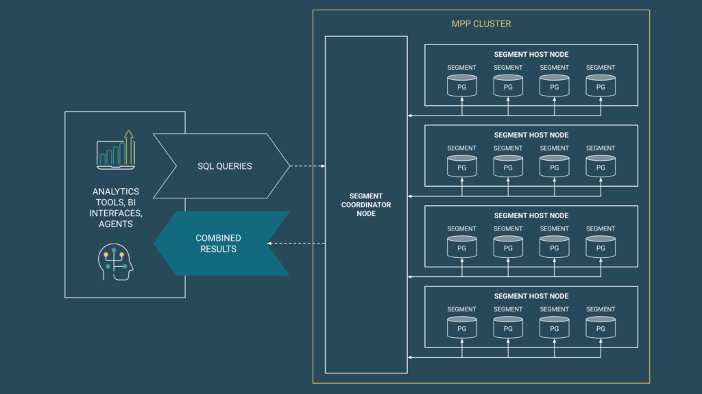 Figure 2: MPP 아키텍처는 여러 독립적인 세그먼트 호스트에 데이터와 작업을 분배하여 성능을 확장합니다. 세그먼트 코디네이터가 최적의 실행 계획을 수립합니다. 각 세그먼트는 할당된 데이터를 동시에 처리합니다(예: 16개 세그먼트가 각각 100만 행 처리).