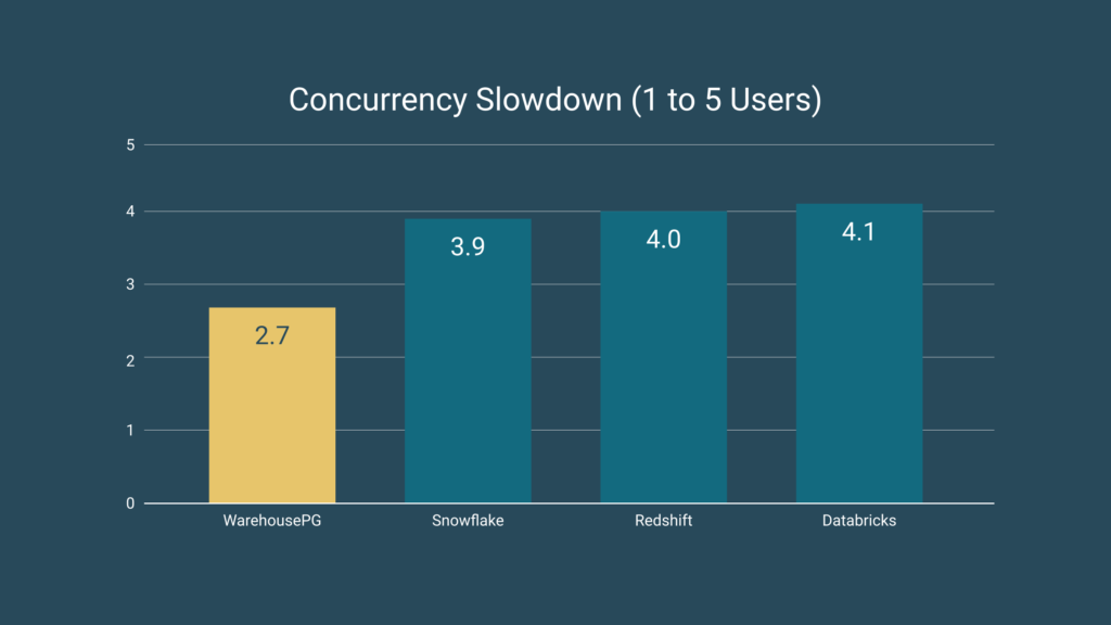 결과는 매우 인상적이었습니다. 동시성 부문에서 WarehousePG는 가장 낮은 성능 저하율(2.7배)을 기록했습니다. 1명에서 5명의 동시 사용자로 확장할 때의 결과입니다. 반면 Snowflake는 3.9배, Redshift는 4.0배, Databricks는 4.1배의 성능 저하를 보였습니다. 둔화율이 낮다는 것은 분석가와 에이전트가 증가해도 사용자 경험이 일관됨을 의미합니다.